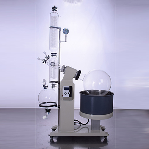 蒸發(fā)瓶恒速旋轉(zhuǎn),水浴鍋恒溫加熱,在此條件下:物料在蒸發(fā)瓶?jī)?nèi)壁形成大面積均勻薄膜快速蒸發(fā),在真空條件下可以提高蒸發(fā)效率(需連接真空裝置),溶媒蒸汽經(jīng)玻璃冷凝盤(pán)管時(shí)冷卻成液體(需連接冷卻裝置),回收于收集瓶。