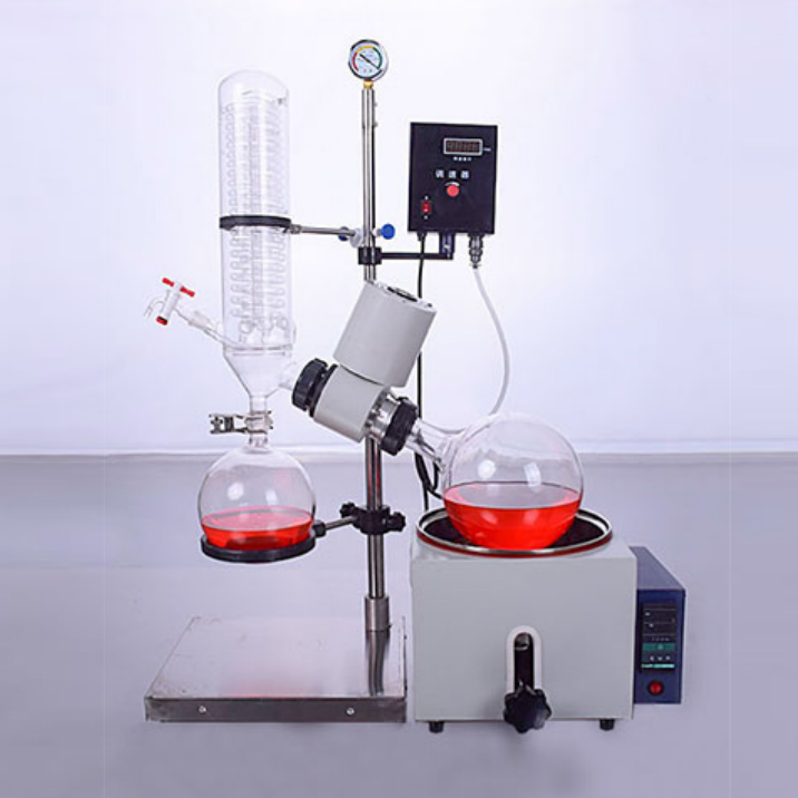 蒸發(fā)瓶恒速旋轉(zhuǎn),水浴鍋恒溫加熱,在此條件下:物料在蒸發(fā)瓶內(nèi)壁形成大面積均勻薄膜快速蒸發(fā),在真空條件下可以提高蒸發(fā)效率(需連接真空裝置),溶媒蒸汽經(jīng)玻璃冷凝盤管時冷卻成液體(需連接冷卻裝置),回收于收集瓶。