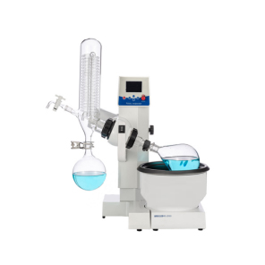 蒸發(fā)瓶恒速旋轉(zhuǎn),水浴鍋恒溫加熱,在此條件下:物料在蒸發(fā)瓶內(nèi)壁形成大面積均勻薄膜快速蒸發(fā),在真空條件下可以提高蒸發(fā)效率(需連接真空裝置),溶媒蒸汽經(jīng)玻璃冷凝盤管時(shí)冷卻成液體(需連接冷卻裝置),回收于收集瓶。